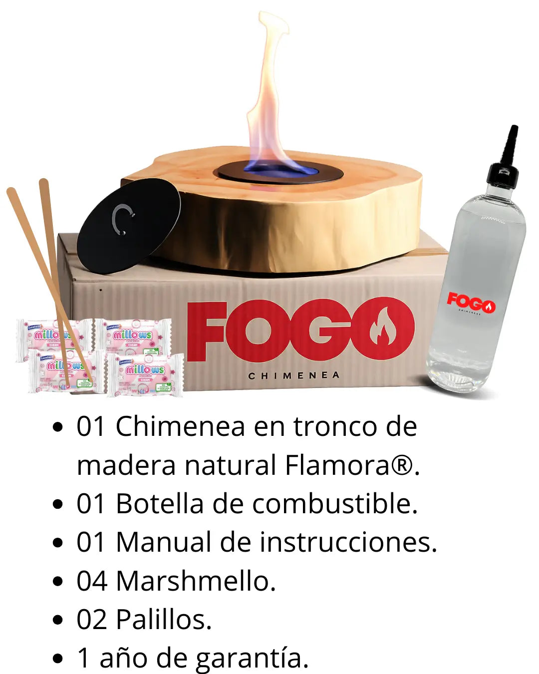 Combustible: Alcohol 96%, un combustible amigable al medio ambiente, seguro para los hogares y que produce una llama controlada que no produce humo ni olores desagradables.